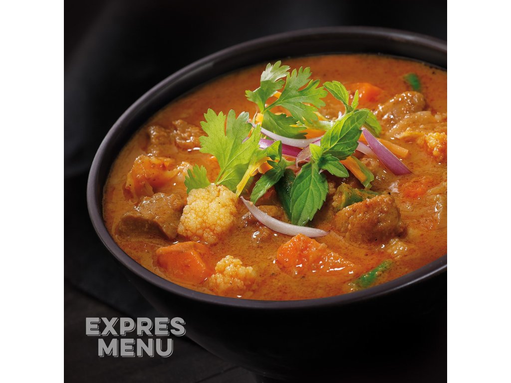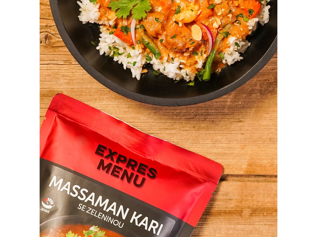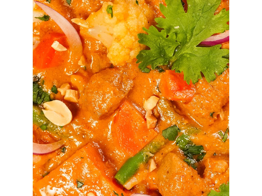 Pestrá zmes zeleniny v krémovej omáčke z kokosového mlieka, dochutená massaman karí pastou a tamarindom uvarená podľa thajskej receptúry. Bezmäsitá pochúťka ideálna s ryžou či rezancami.