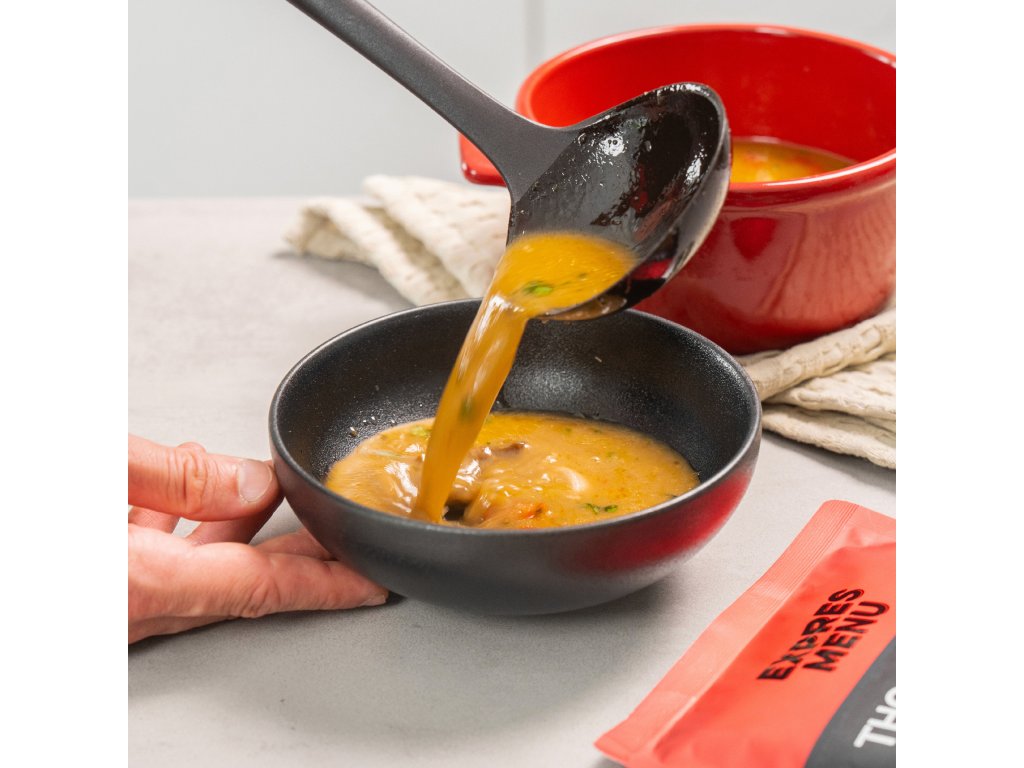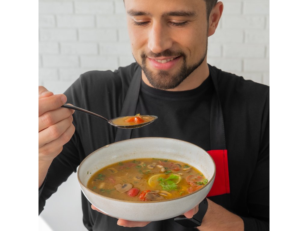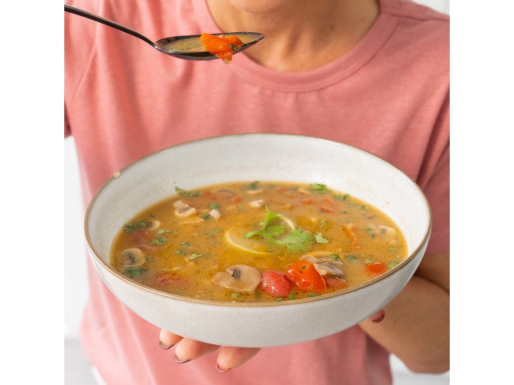 Kokosová polievka podľa thajskej receptúry s kuracím mäsom, šampiňóny a rajčinami, prevoňaná citrónovou trávou a limetkou. Ľahko pikantná, krémová s dokonale vyváženou chuťou.