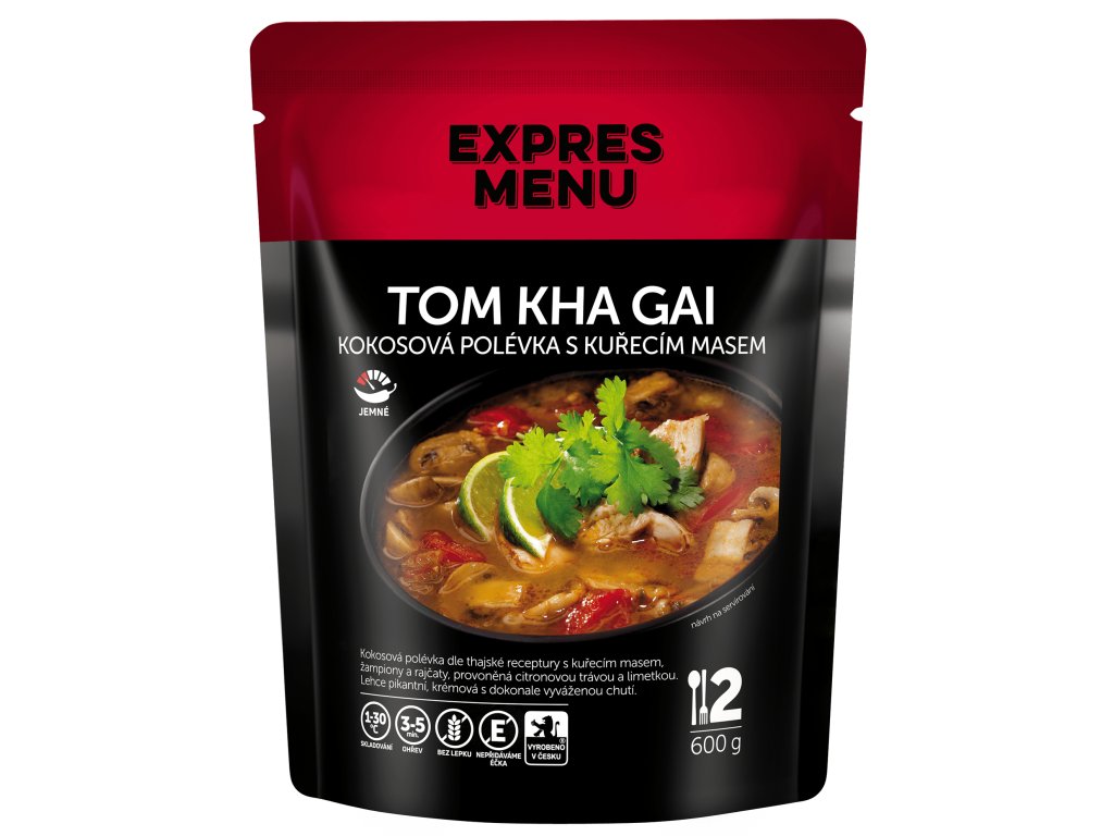 kokosové mlieko (16 %) (kokos, pitná voda), kuracie stehno (15 %), paradajky(8,6%), huby(8%), limetková šťava(3,2%), rybacia omáčka(2%)(sardelový extrakt 63%, pitná voda,jedlá soľ, cukor), kurací vývar (kuracie kosti, pitná voda), citrónová tráva(1,6%), koriandrové listy, rímska rasca, mletý koriander, čili, sušené listy gáfrovej limetky.
